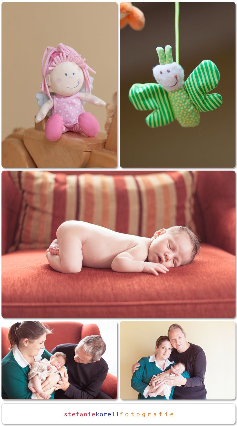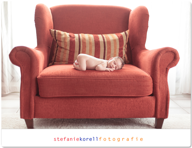 Wir verwandelten das Wohnzimmer zum Fotostudio. Besonders gut gefällt es mir Luisa auf dem riesigen roten Sessel zu sehen. Das wird bestimmt lustig für sie und ihre Familie wenn sie in einigen Jahren, kräftig gewachsen, auf dem roten Sessel sitzt und dieses Fotos wieder einmal anschauen wird. Das ist eine großartige Erinnerung. Um solche Momente geht es bei Neugeborenenfotoshootings. Denn die kleinen werden so schnell groß.